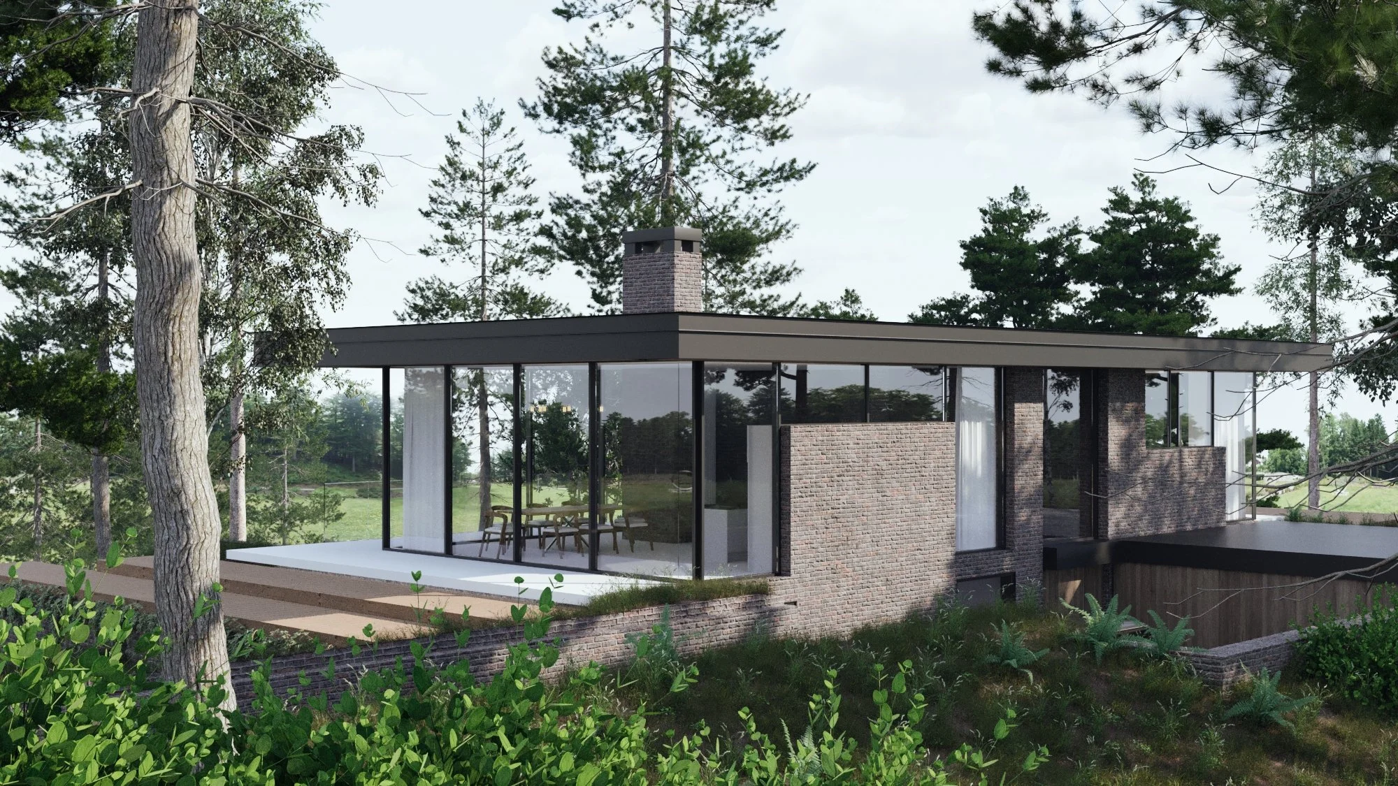 16a were commisioned to design a new build house for a client with a plot of land in dale gardens, heswall, wirral. nestled within a woodland setting, a brick plinth creates private spaces within the subterranean space.